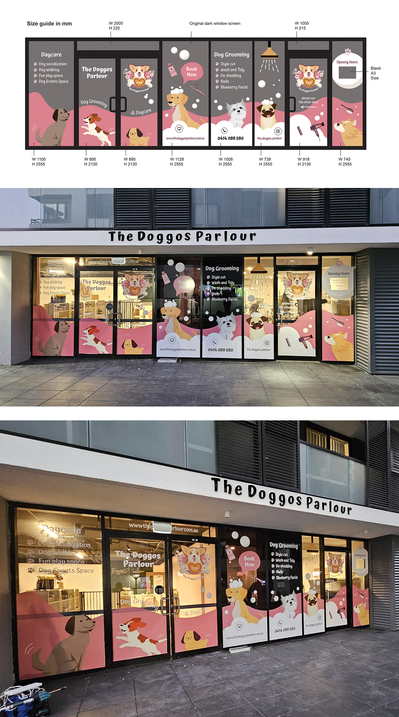 The Doggos Parlour is a Pet Grooming and Daycare based in Sydney, Australia. We helped to design front foor sticker for their newly renovated shop in 2024.