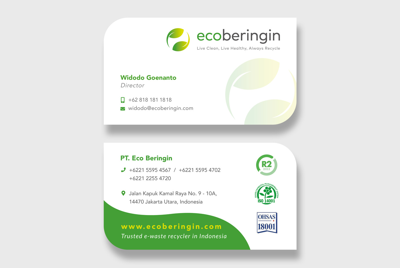 We redesigned their logo to have a more modern look and to better portray their business through it. The concept of this logo is using 2 leaves in a recycling cycle, which gives the impression that the company is very eco-friendly, in accordance with the company's mission which is recycling electronic waste that has been destroyed. The typeface tends to have round shapes to give a modern and eco-friendly impression.