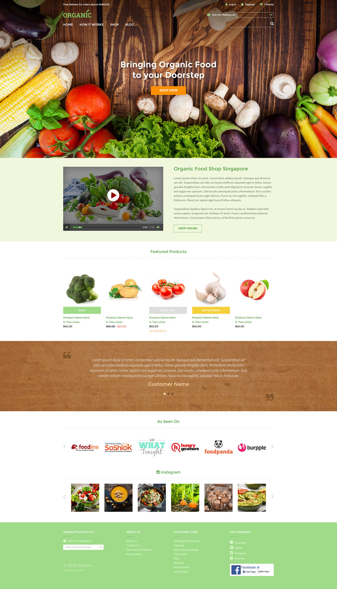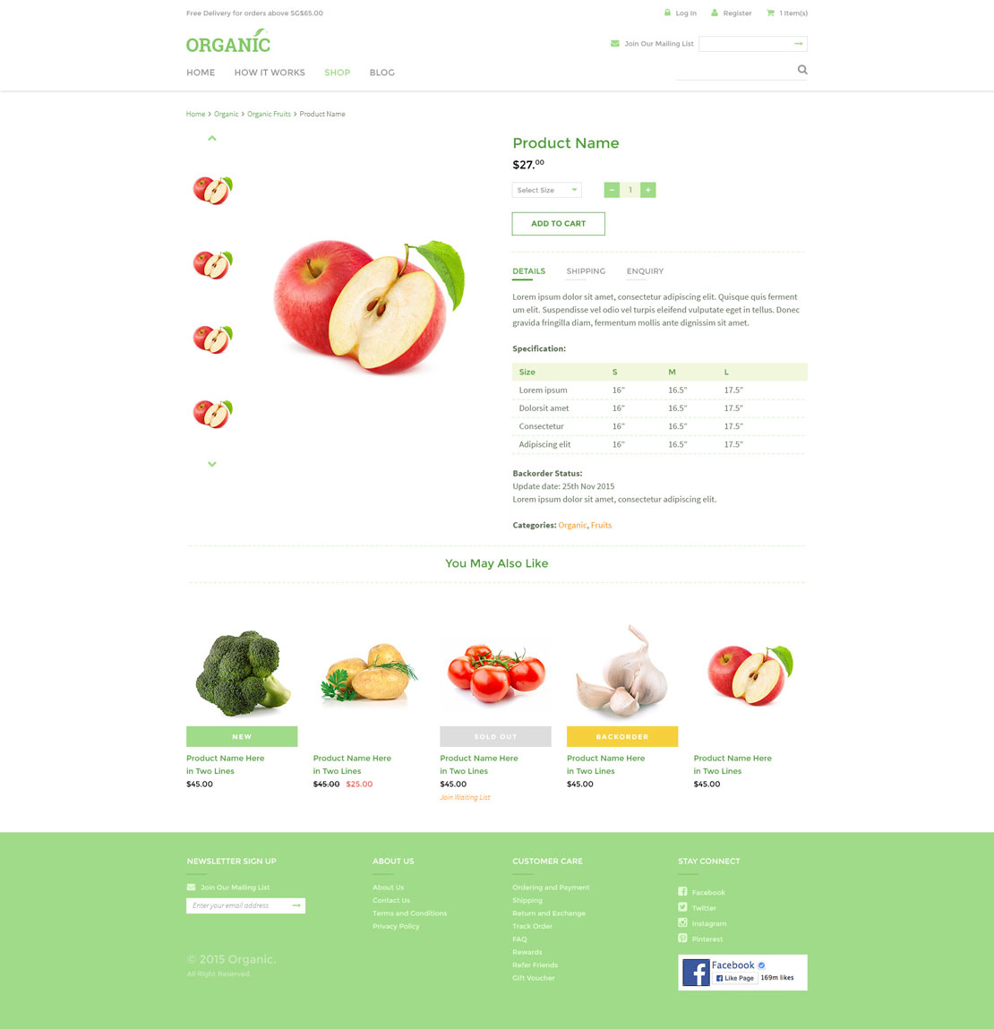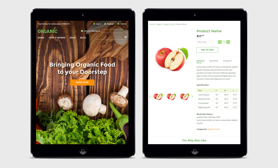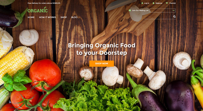 Working closely with a Singapore web design agency to create an e-commerce website template with organic theme to target shops that supply healthy food / medicine / fresh organic produce / natural products. We came up with a clean design with green and orange color scheme to support the organic feel. We provided the interface design layout complete from desktop to tablet and mobile version as this is a fully responsive e-commerce template.